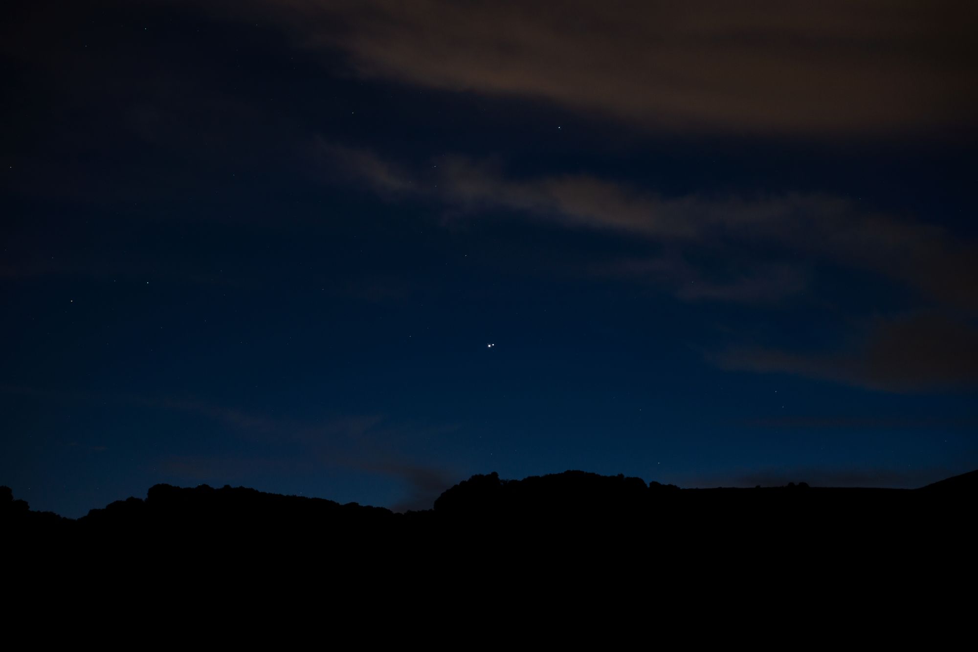I was lucky enough to have a break in fog and a high hill to climb to see the conjunction, and took two photos I was pleased with (out of about 30). The landscape photo was taken at 50mm, and the portrait taken with a 10mm exposure. I took several exposures at 200mm, but was unsatisfied with the results, due to the noise being too high from the ISO.