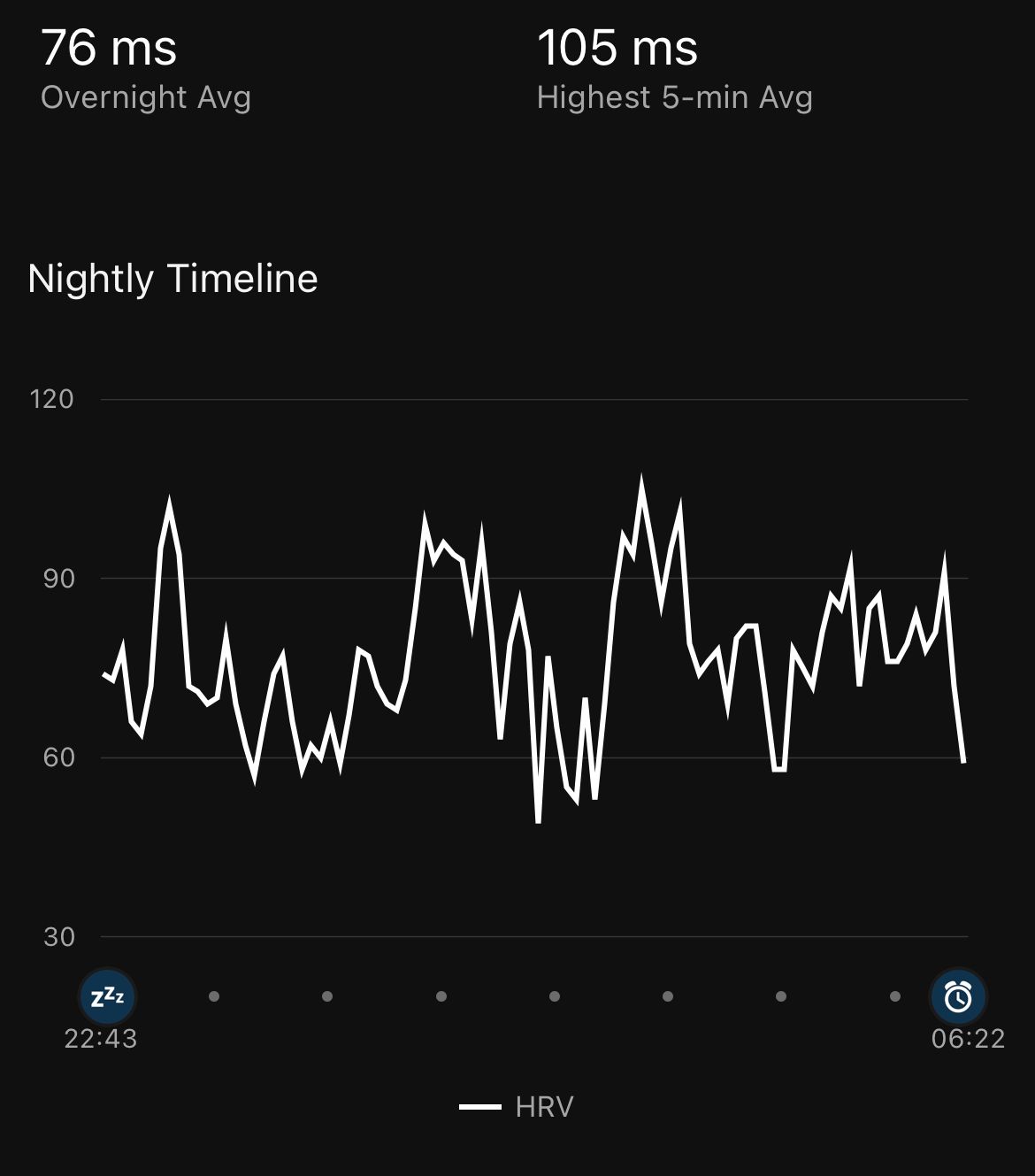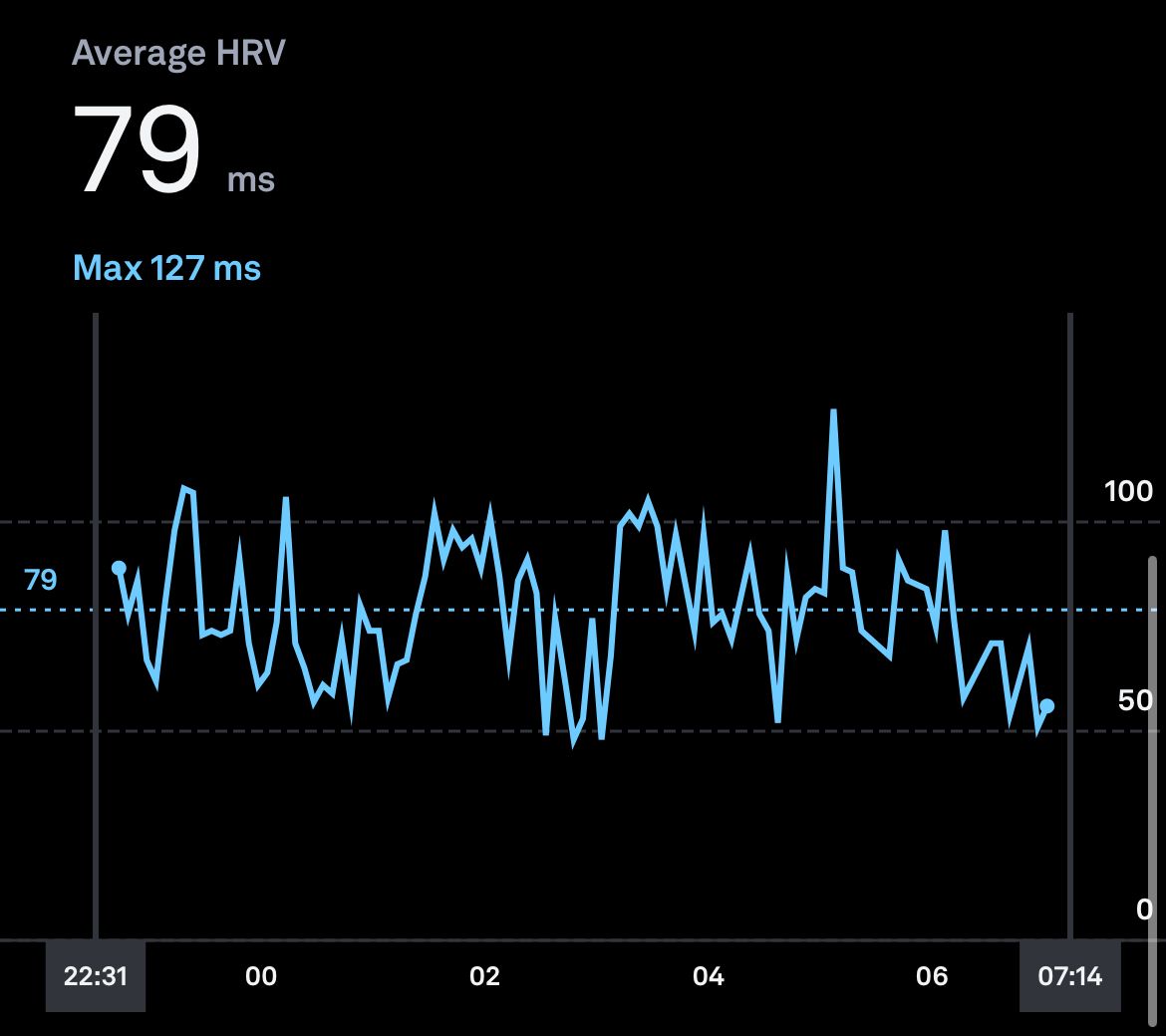 Garmin's high for the night was 115ms, and the average was 79ms, and aside from the pause in data collection on the ring's part, the two graphs look overly similar.
